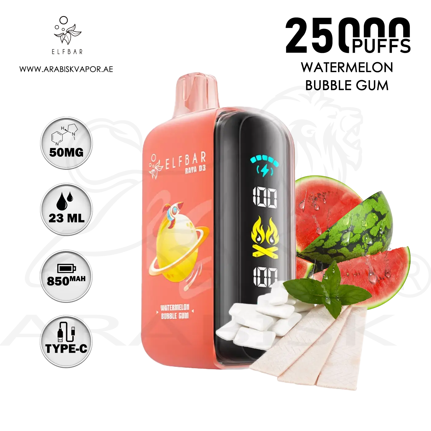 ELFBAR RAYA D3 25000 PUFFS 50MG - WATERMELON BUBBLE GUM